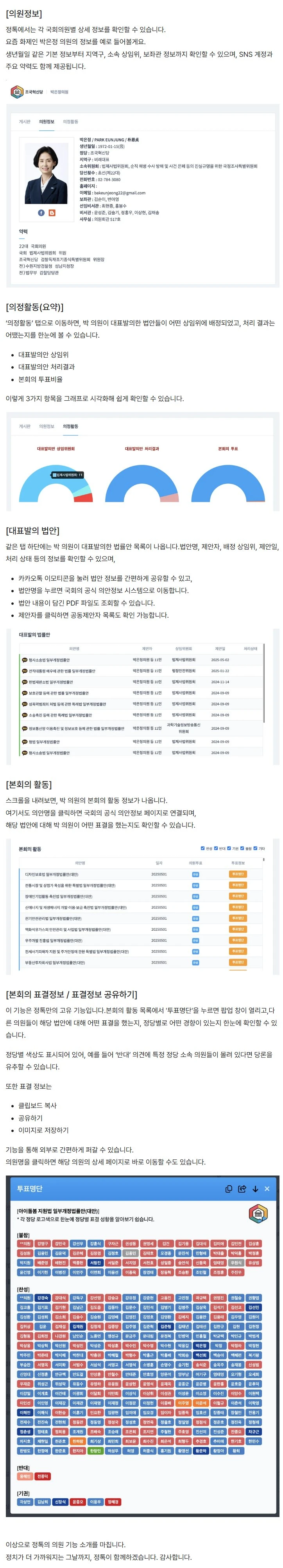 다른곳에도 있는 기능들도 많지만, '시각화된 표결 정보'라든가 '국회의원 의정활동 비교'는 국내에 다른 사이트에는 없는거 같더라구요.