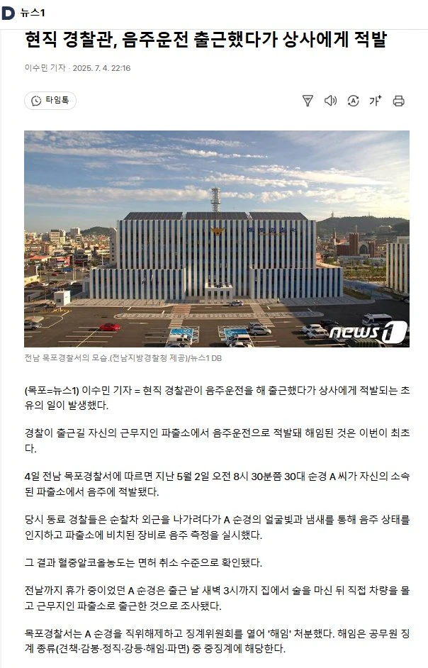 경찰관이 전날 술마시고 자신의 지구대로 출근한 초유의 결과
