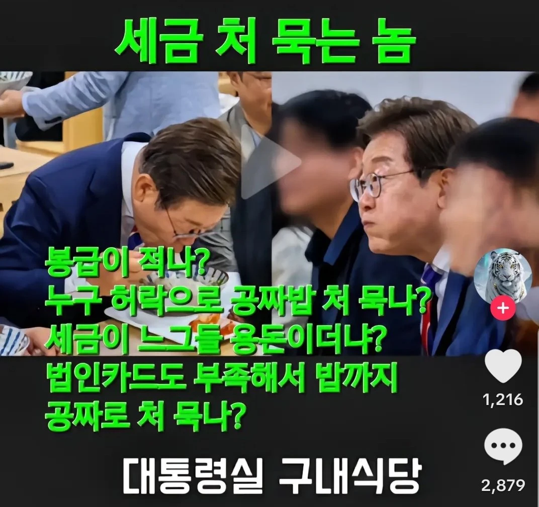 꽁짜밥? 누가 꽁짜밥주냐? 공무원, 사기업직원 구내식당 혹은 식대지원이 꽁짜니? 그리고 대통령은 공무원아님? 이게 왜 문제임? 남남갈등 지령받은 간첩이라 모르나?