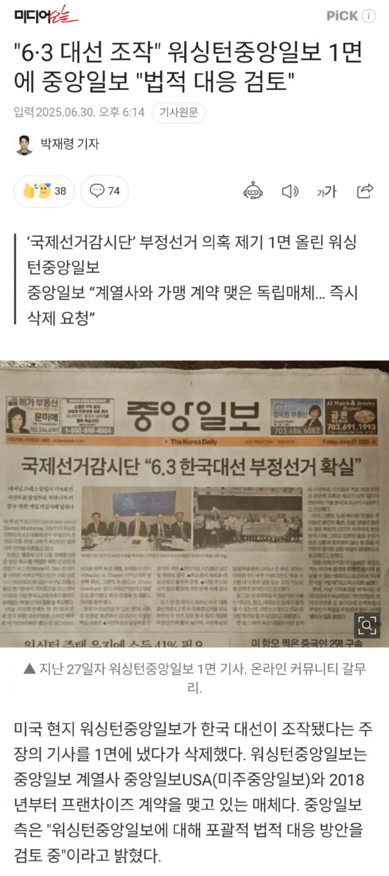 중앙일보 부정선거 주장한 워싱톤 중앙일보 법적대응