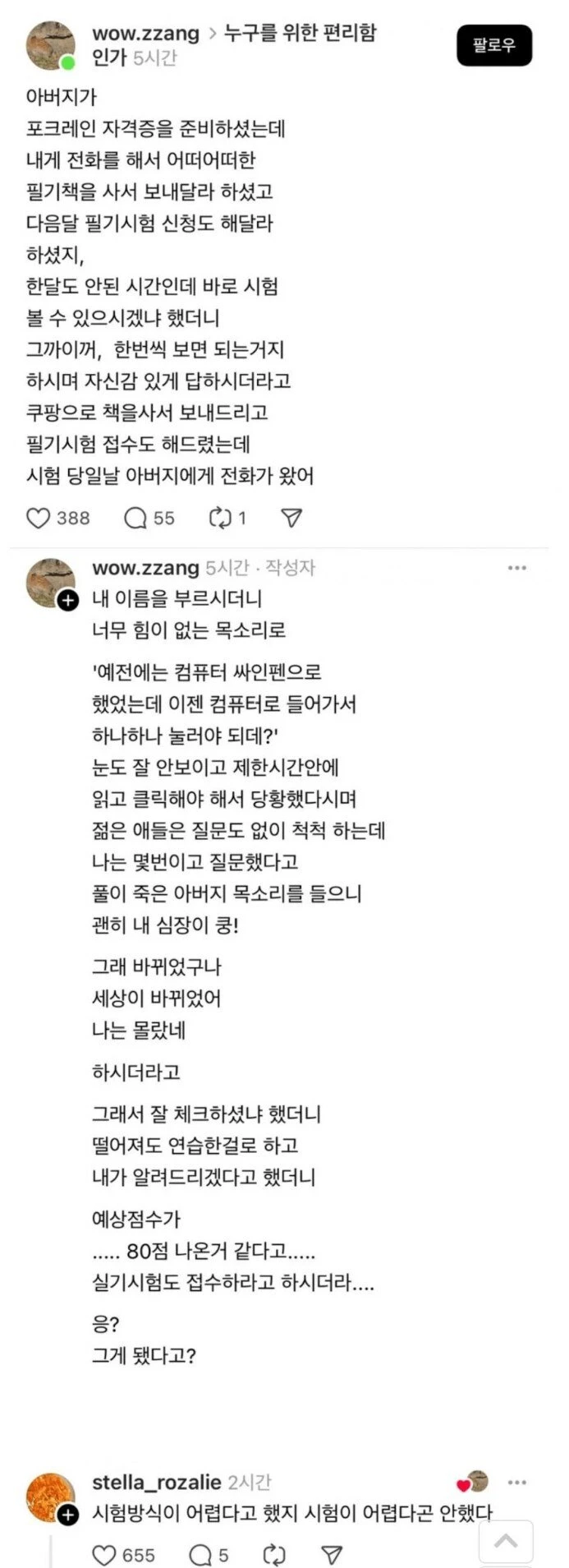 포크레인 자격증 필기 시험을 보고 풀이 죽으신 아버지 ㅠㅠ