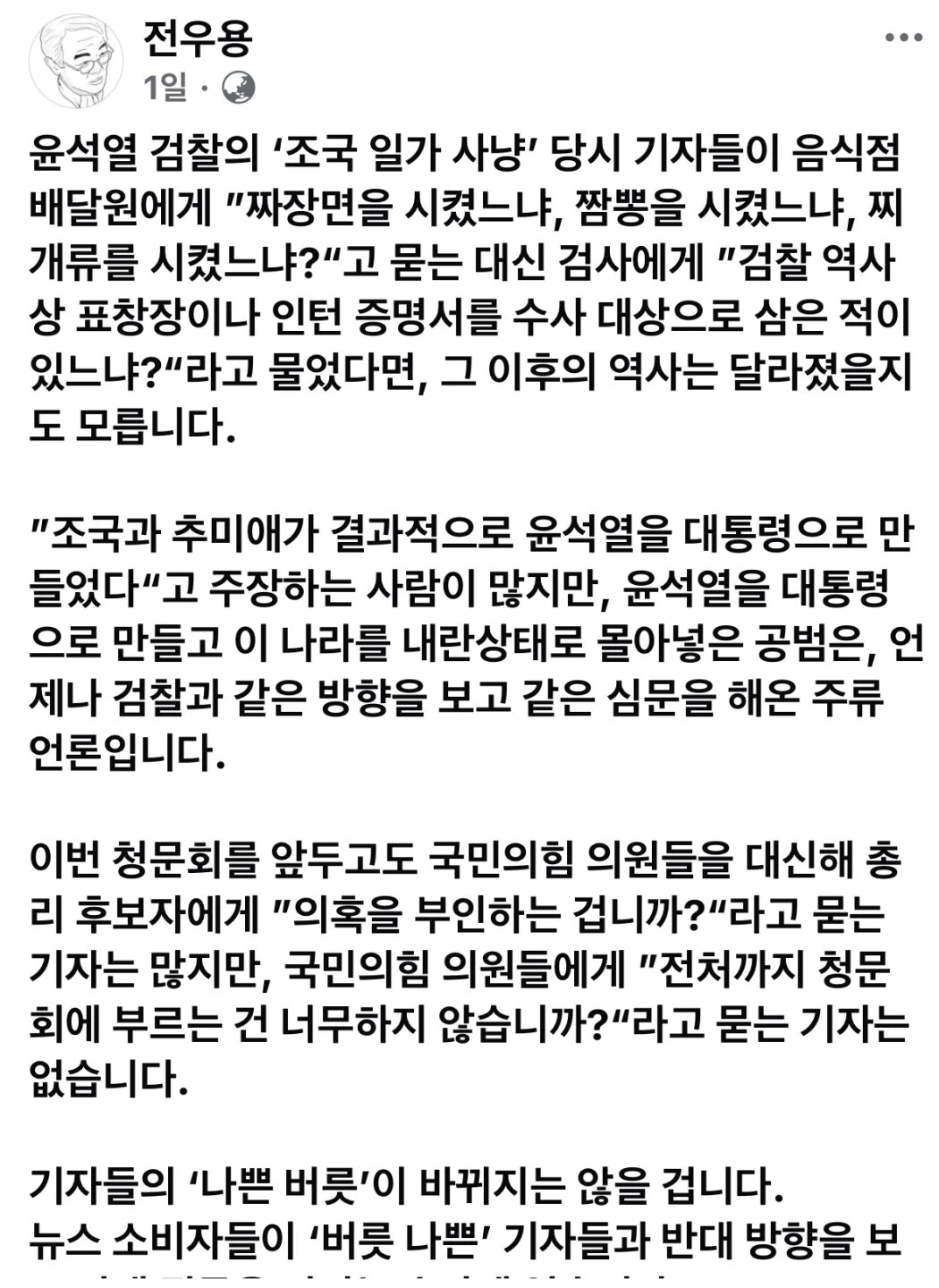 윤석열 검찰의 ‘조국 일가 사냥’ 당시 기자들이 음식점 배달원에게 ”짜장면을 시켰느냐, 짬뽕을 시켰느냐, 찌개류를 시켰느냐?“고 묻는 대신 검사에게 ”검찰 역사상 표창장이나 인턴 증명서를 수사 대상으로 삼은 적이 있느냐?“라고 물었다면, 그 이후의 역사는 달라졌을지도 모릅니다.