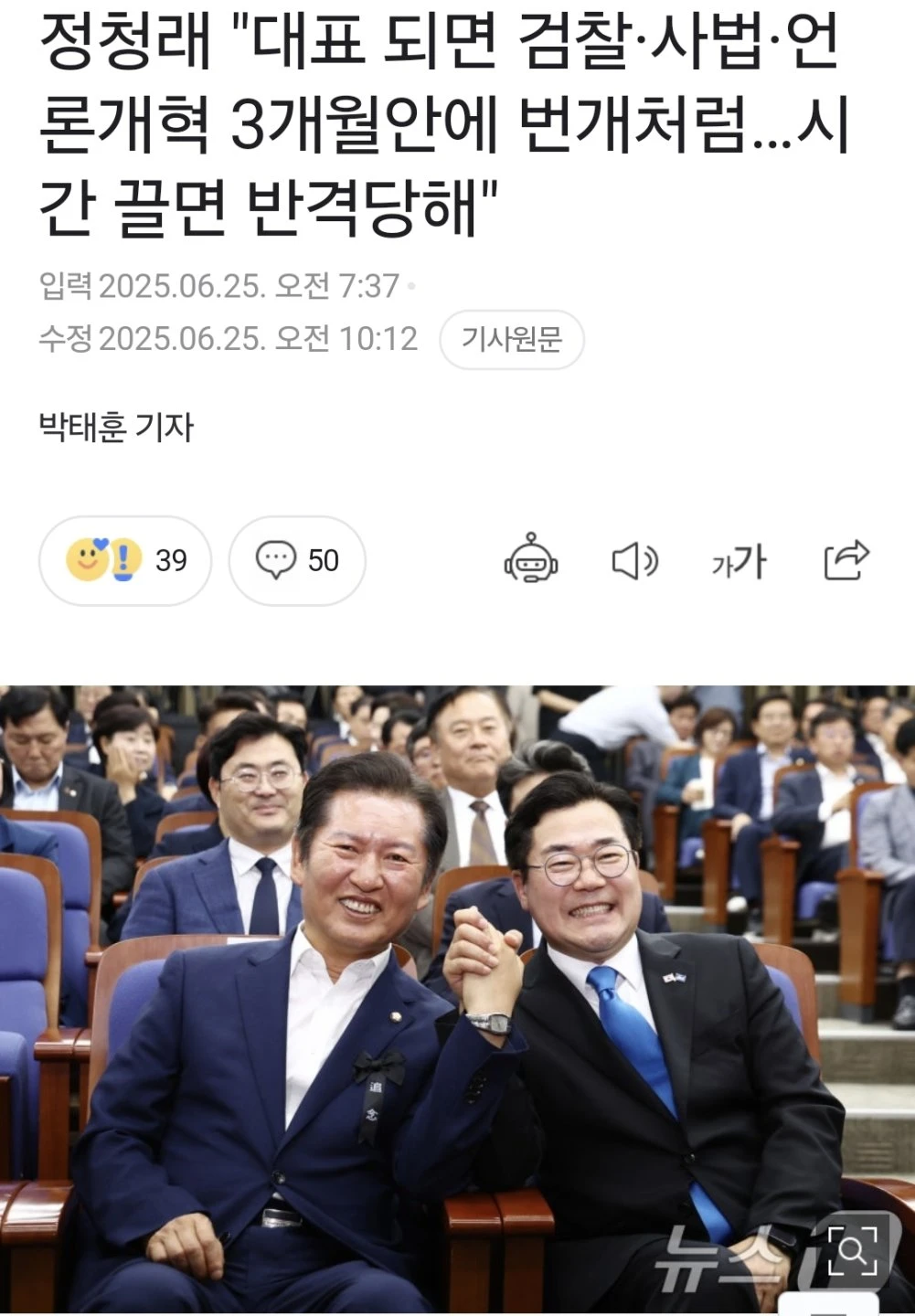 정청래 "대표 되면 검찰·사법·언론개혁 3개월안에 번개처럼&qu…