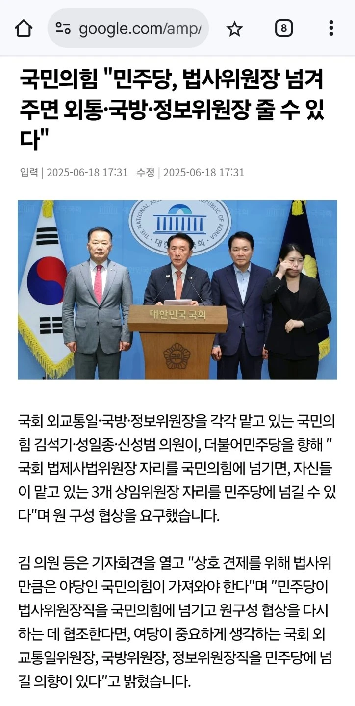 국민의힘 "민주당, 법사위원장 넘겨주면 외통·국방·정보위원장 줄 수 있다 rotla 0 91 0 2025.06.27 21:52 응 ㅈㄲ 백수 준비나 해 0