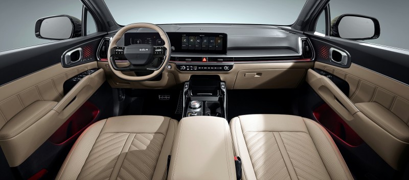 The 2026 쏘렌토는 새로운 디자인의 4스포크 스티어링 휠이 탑재됐으며, 앰비언트 라이트가 1열 도어 맵포켓까지 확대 적용돼 실내 고급감이 더욱 향상됐다.