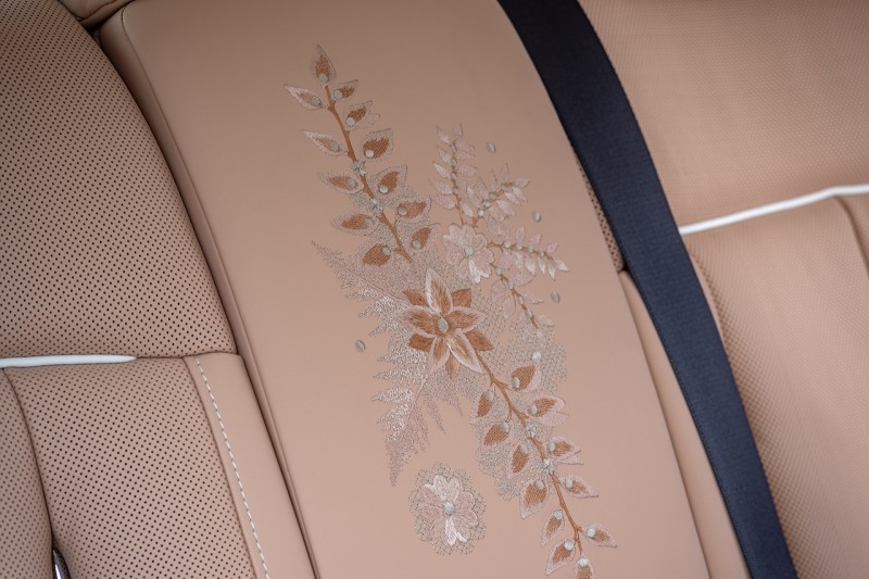 뒷좌석 중앙의 ‘워터폴’ 구간에도 유사한 꽃무늬 자수가 약 7만 땀으로 적용됐으며, 실내 가죽과 로즈 골드 마감의 스피커 그릴 등과 조화를 이루도록 설계됐다. 내부는 선라이즈 및 그레이스 화이트 가죽, 피아노 화이트 베니어, 헤드레스트의 ‘RR’ 모노그램 자수 등으로 마감됐다.