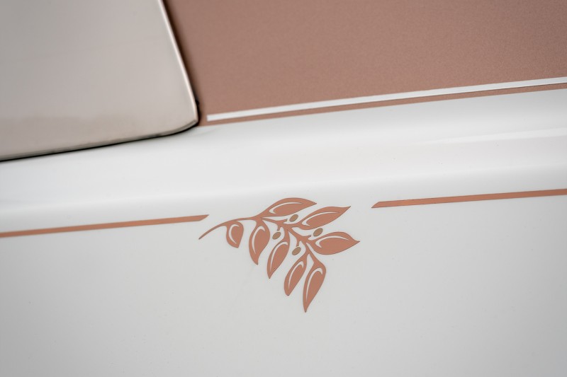 외장은 두 가지 비스포크 색상으로 마감됐다. 차량 하단은 ‘크리스털 오버 아틱 화이트’, 상단은 고객을 위해 개발된 ‘크리스털 오버 팔레 나마스카르 던’ 색상이 적용됐다. 측면에는 선라이즈 색상의 더블 코치라인이 추가됐으며, 후면에는 진주 열매를 형상화한 잎사귀 모티프가 수작업으로 그려졌다.