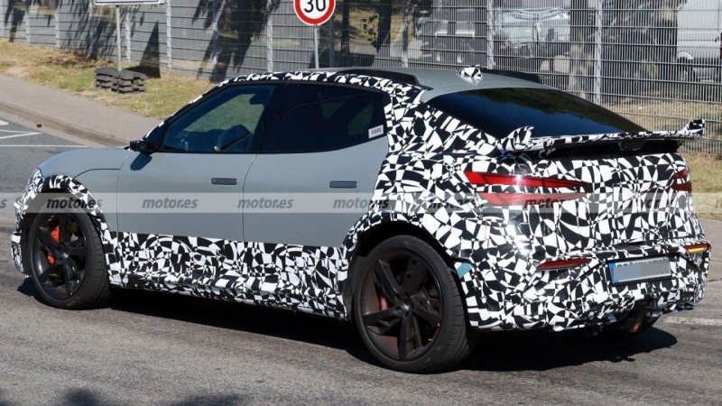 후면부에는 이전 GV60에서는 볼 수 없었던 독특한 2개의 기둥에 지지된 리어 스포일러가 새롭게 적용되었는데, 이는 IONIQ 6 N의 디자인과 유사한 모습입니다. 이 리어 스포일러는 선택 사양으로, 고성능 퍼포먼스 패키지 구성에 포함될 예정입니다. 리어 디퓨저는 중앙부가 위장막에 가려져 있지만, 일부 테일램프가 하단 범퍼 라인과 통합된 형상으로 나타났습니다.