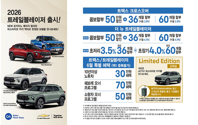 지난 5월 새롭게 출시된 2026년형 트레일블레이저 구매 고객은 초저리 또는 초장기 할부 프로그램을 선택할 수 있다. 3.5% 이율 최대 36개월, 또는 4.0% 이율 최대 60개월 할부 조건이 적용되며, 액티브 리미티드 에디션 구매 시에는 특별 출고 기념품도 증정된다. 2025년형 모델의 경우 4.5% 또는 4.9% 이율로 최대 60개월까지 할부가 가능하며, 현금 50만 원 지원 및 1월 이전 생산 차량에 한한 유류비 50만 원 지원 혜택도 마련돼 있다.