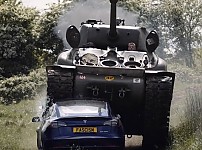 정치활동단체 '레드 바이 동키스(Led By Donkeys)'가 일런 머스크 CEO를 비판하는 시위에서 테슬라 모델3에 탱크를 돌진시켰으나, 오히려 전기차의 견고한 안전성이 증명…