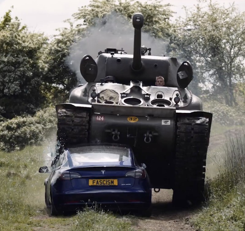 정치활동단체 '레드 바이 동키스(Led By Donkeys)'가 일런 머스크 CEO를 비판하는 시위에서 테슬라 모델3에 탱크를 돌진시켰으나, 오히려 전기차의 견고한 안전성이 증명되는 결과로 이어졌다.