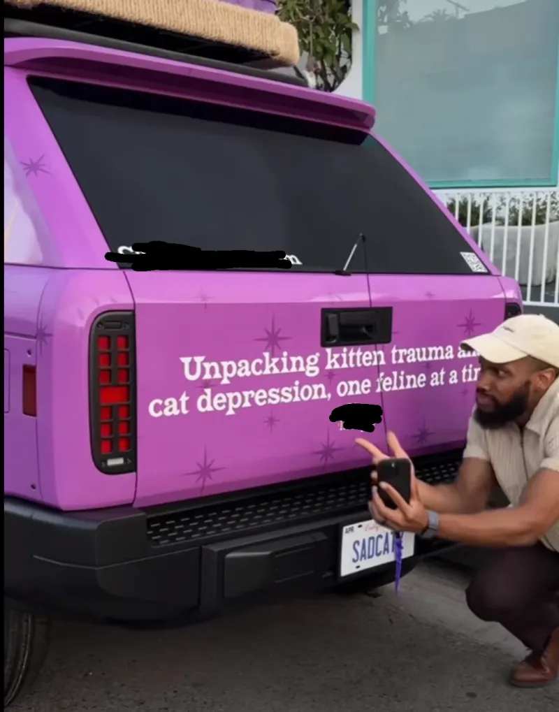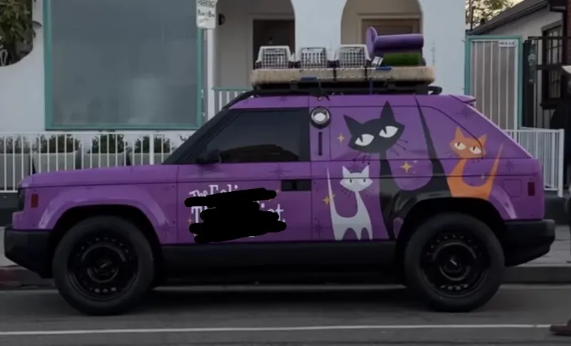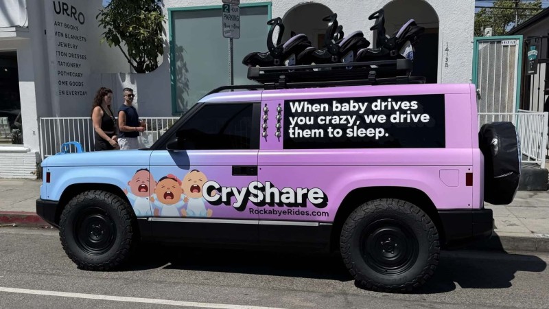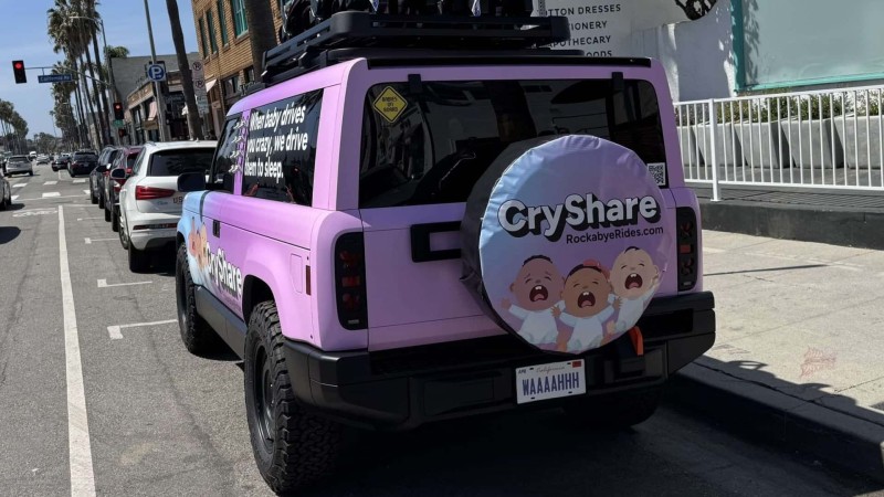 "CryShare"(애기 울 때 운전해서 재워준다는) 로고 붙인 SUV도 있고, 고양이 테라피 홍보하는 보라색 2도어 프로토타입도 있습니다