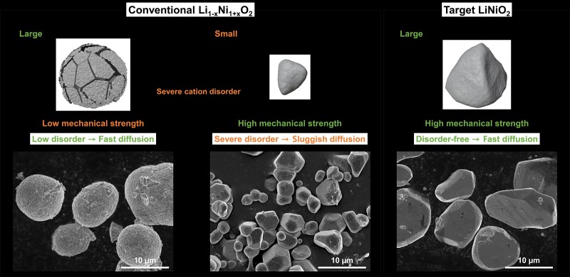 연구팀이 개발한 건 니켈 함량 94% 이상의 울트라 하이니켈 단결정 양극재다. 기존 다결정 양극재와 같은 10마이크로미터 크기의 대형 입자를 구현하면서도 양이온 무질서 현상을 완전히 배제하는 데 성공했다.