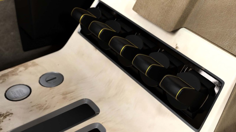 창문과 조명 버튼은 천장에 배치했으며, 점화 시스템도 독특하다. 키를 센터 콘솔에 삽입한 후 천장의 "engage" 버튼을 누르고, 다시 센터 콘솔의 "start" 버튼을 눌러야 시동이 걸린다.
