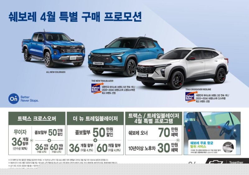 글로벌 브랜드 쉐보레(Chevrolet)가 ‘쉐보레와 함께하는 4월 봄맞이 드라이브’ 프로모션을 시행하며 국내 고객들에게 풍성한 혜택을 제공한다.