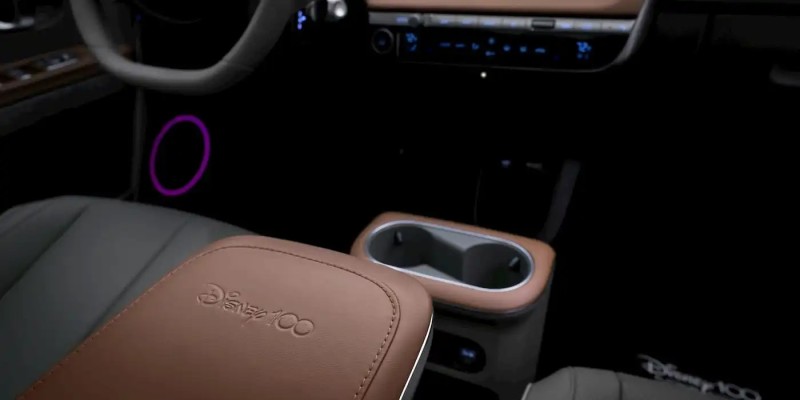 실내는 테라브라운/머드그레이 투톤에 전좌석 헤드레스트, 센터콘솔, 매트에 디즈니100 로고 새겨져있음. 시동 걸면 센터 스크린에 디즈니 인트로 재생되고 클래식 디즈니 음악도 나오는 깨알 포인트까지.