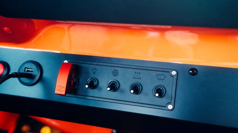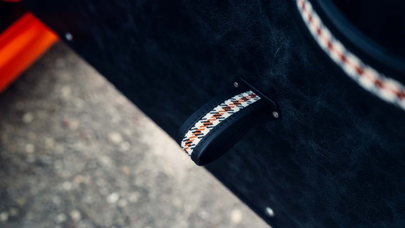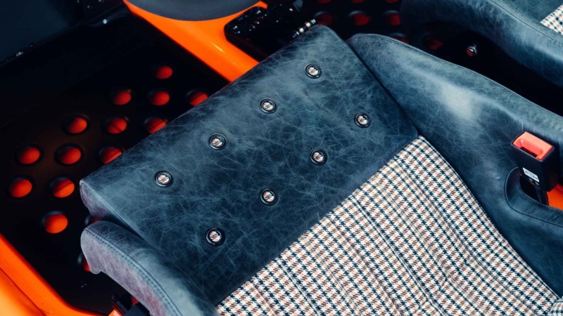 실내는 노출된 금속과 고급 소재의 조화가 돋보인다. 스포르텍은 플라스틱 부품을 모두 알루미늄 CNC 가공 부품으로 대체했다. 카본 파이버 대시보드, 맞춤형 스포츠 스티어링 휠, 새로운 계기판, 카본 소재의 레카로 폴 포지션 시트 등이 적용됐다. 공개된 차량은 블랙우드 빈티지 가죽과 페피타(Pepita) 패브릭으로 마감됐다. 알루미늄 CNC 가공 핸드브레이크 레버도 인상적이다.