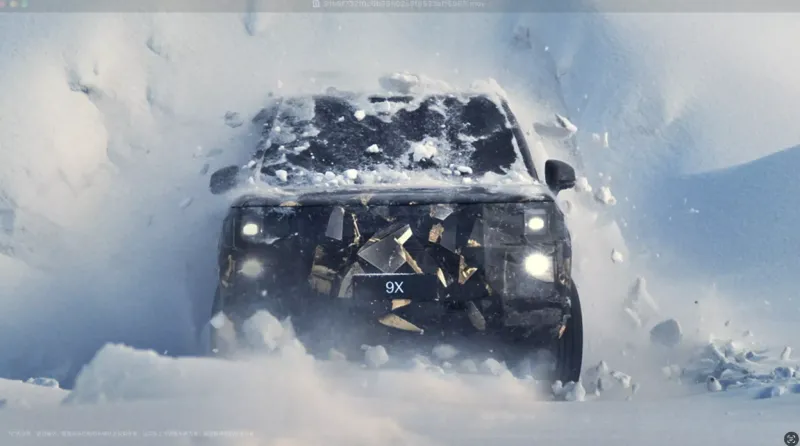 공식 이미지에서 9X 그랜드는 여전히 두꺼운 위장막으로 가려져 있지만, 주요 외관 디자인 특징을 확인할 수 있다. 이 차량은 견고한 비율과 높은 벨트라인을 가진 긴 차체를 자랑하며, 평평한 루프라인과 기울어진 D필러가 특징인 레인지로버를 연상시키는 외형을 갖추고 있다. 차체 길이는 5.2미터 이상으로 대형 SUV임을 확인할 수 있다.