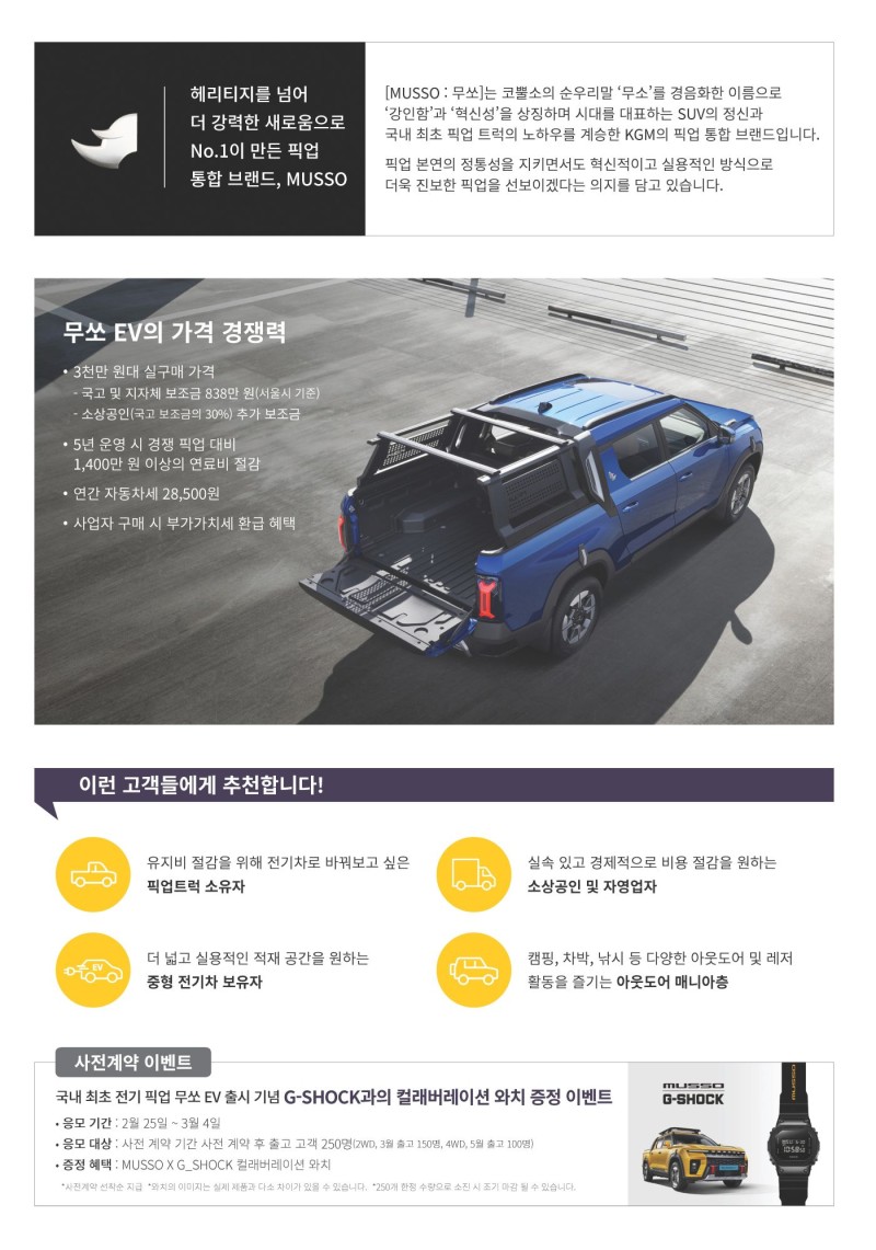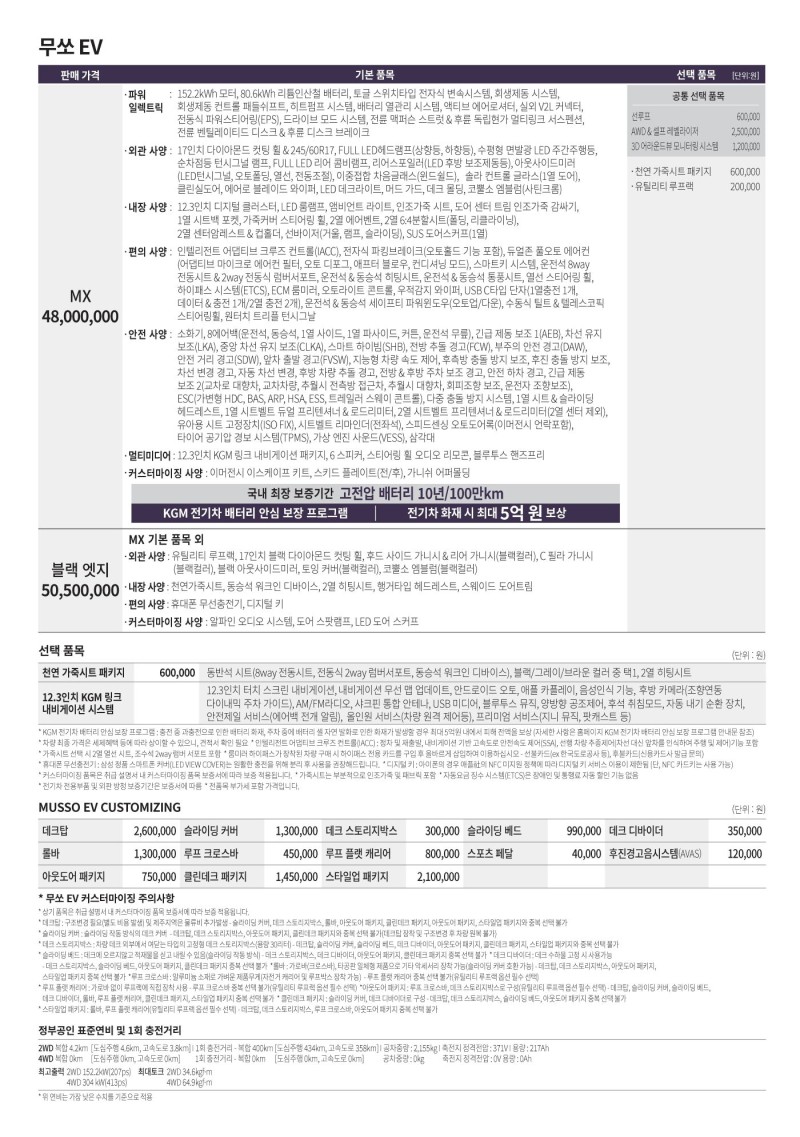 400마력 오버 KGM 무쏘 EV 등장 튜9 0 312 0 2025.02.25 14:07 쌍용하고 KGM 시절 모두 합쳐서 400마력 넘는 모델은 첨인 거 같은데 맞나요?싱글이 207마력이고 듀얼은 413마력이네요 0