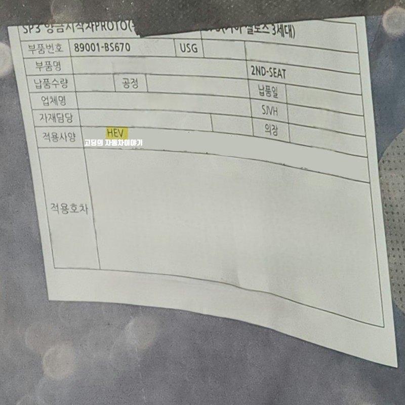 차량에 특이하게 '시트 사양표'가 붙어있더군요. 그래서 혹시나 확인해보니, '한국 HEV'를 발견했습니다.
