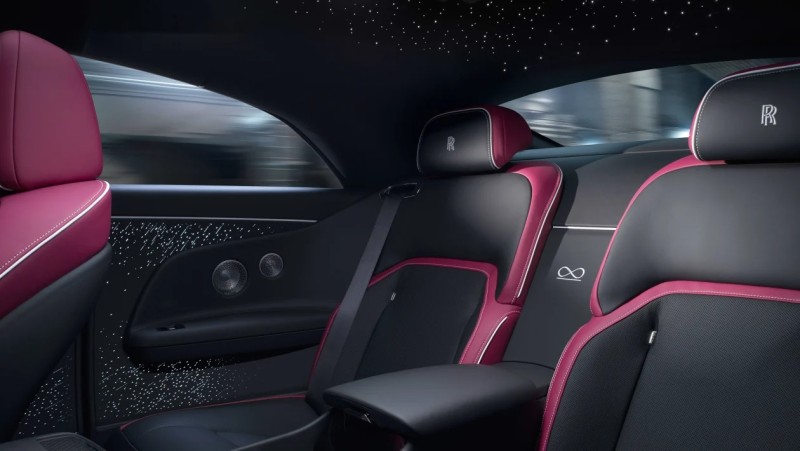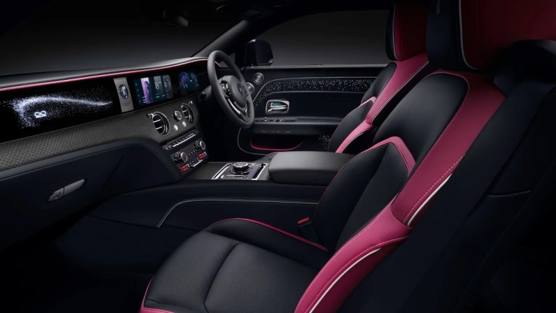 실내는 과감한 디자인으로 강렬한 분위기를 자아낸다. 환희의 여신상을 추상적으로 표현한 일루미네이티드 페시아에는 인피니티 심볼이 더해졌으며, 5,500개의 '별'이 다양한 크기와 밝기로 수놓아져 있다. 이는 다이아몬드 형태의 테크니컬 파이버 마감으로 둘러싸여 있으며, 뒷좌석 '워터폴' 섹션에도 블랙 배지 인피니티 심볼이 정교한 자수로 새겨져 있다.