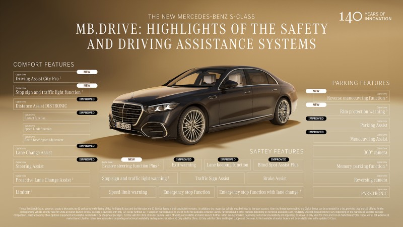 신형 S클래스는 미래 기능을 위한 충분한 전력 예비를 제공하는 수랭식 슈퍼컴퓨터를 탑재했다. 최고 수준의 주행 보조를 제공하기 위해 모든 모델에 광범위한 센서 어레이가 장착된다. 외부 카메라 10개, 레이더 센서 5개, 초음파 센서 12개다.