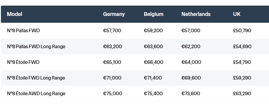 출시 라인업은 기본형 ‘Pallas’와 고급형 ‘Étoile’ 두 가지 트림으로 구성된다. 전륜구동 모델은 표준 배터리(74kWh)와 장거리 배터리(97.2kWh) 중 선택 가능하며, 최상위 사양으로 장거리 배터리를 탑재한 사륜구동 모델이 제공된다.