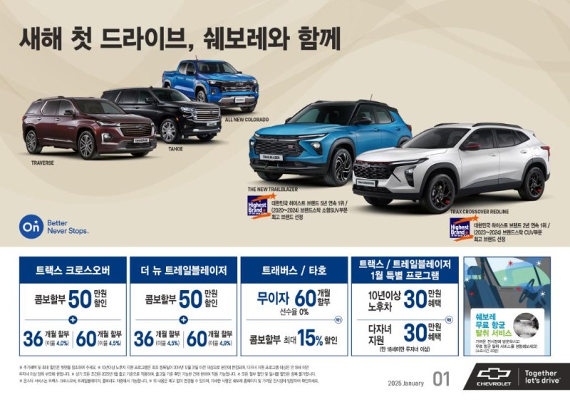 쉐보레가 1월, ‘새해 첫 드라이브, 쉐보레와 함께’ 프로모션을 시행하며 국내 고객들에게 무이자 할부를 포함한 다양한 할부 프로그램, 일시 혜택, 현금 지원 등 풍성한 혜택을 제공한다.