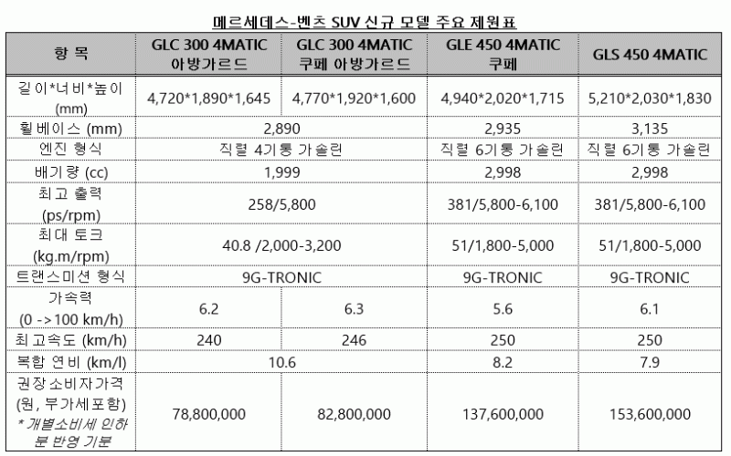 이로써 GLC 및 GLC 쿠페, GLE 쿠페, GLS 등 메르세데스-벤츠의 중형 및 대형 SUV 세그먼트 4개 모델에서 선택 가능한 트림이 기존 6종에서 10종으로 확대됐다. 고객은 디자인 및 파워트레인 등 선호도에 따라 보다 세분화된 모델을 선택해 구매하는 것이 가능하게 됐다.