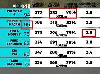 주행거리는 폴스타4배터리 용량은 포르쉐 마칸전비는 테슬라 모델Y