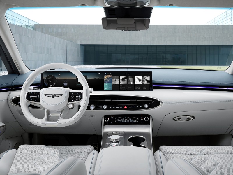 제네시스는 GV70 전동화 모델에 클러스터와 인포테인먼트 시스템을 하나로 합친 27인치 통합형 와이드 디스플레이, 터치 타입 공조 조작계를 탑재해 하이테크한 느낌을 강조했다.