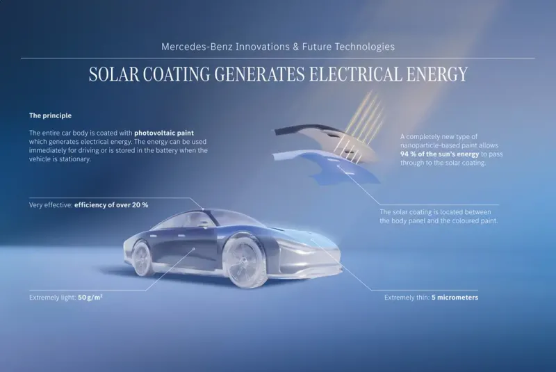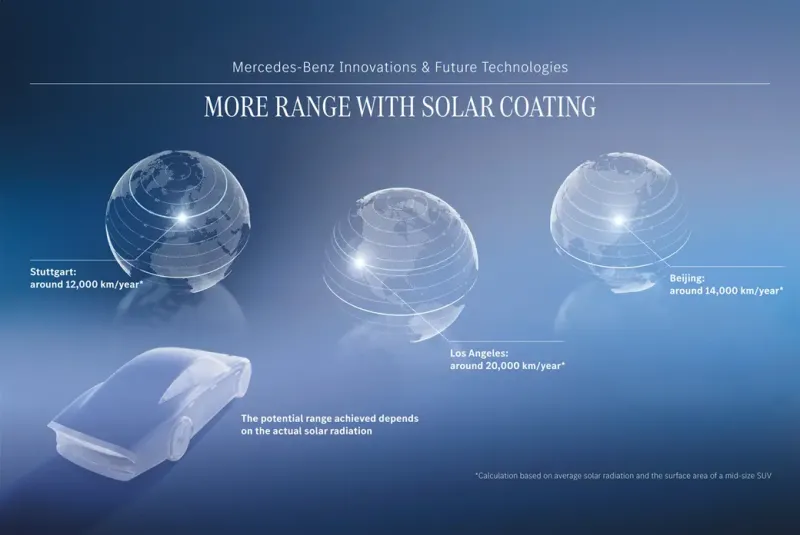 더불어 벤츠는 차체에 태양전지를 입히는 '솔라 코팅' 기술도 개발 중이다. 니엘스 슈뢰더스 엔지니어는 "EQE SUV 크기의 차량에 솔라 코팅을 적용하면, 독일 슈투트가르트 기준으로 연간 12,000km, 로스앤젤레스에서는 연간 19,000km의 추가 주행이 가능하다"고 밝혔다.