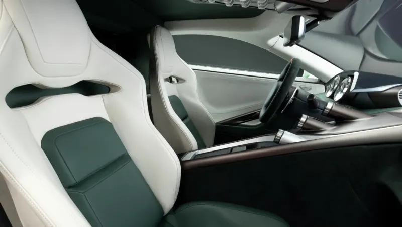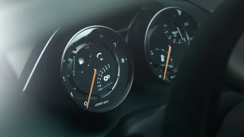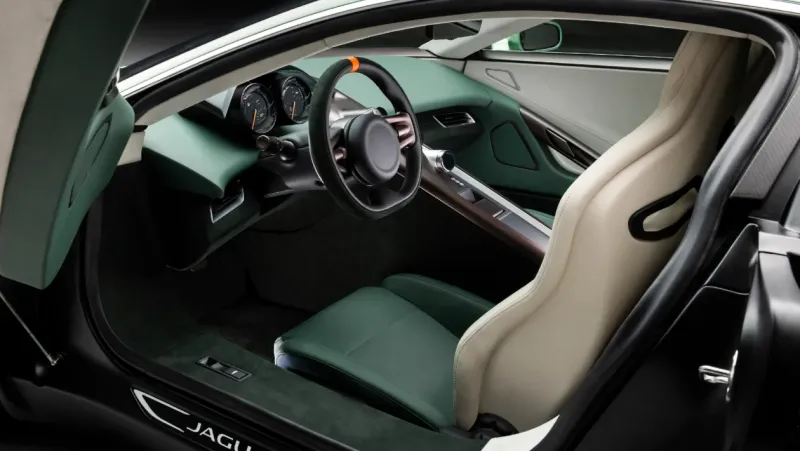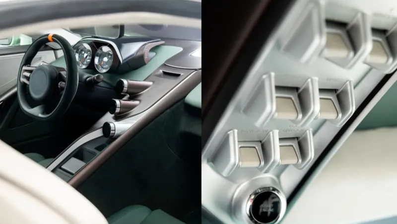 실내는 현대적 하이퍼카에 걸맞은 수준으로 완전히 재설계됐다. 스턴트카에 있던 기본적인 제어 패널들은 모두 사라지고, 포르쉐 918 스파이더를 연상시키는 '애로우헤드' 중앙 콘솔이 자리 잡았다. 여기에는 터치스크린이 통합된 3개의 로터리 컨트롤이 배치됐으며, 애플 카플레이, 무선 충전, 맞춤형 사운드 시스템도 갖췄다. 스티어링 휠, 대시보드, 계기판 등이 모두 새롭게 제작됐으며, 3D 프린팅으로 제작한 컵홀더까지 섬세하게 신경 썼다. 다크 그린과 크림 색상의 투톤 인테리어는 시트의 '워터라인' 디자인으로 세련되게 구분된다.