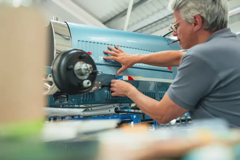 여튼 이곳에서 제작되는 베이비 2는 그 자체로 하나의 예술 작품입니다. 알루미늄 바디 패널은 숙련된 장인의 손길로 하나하나 정성스럽게 만들어집니다. 건메탈 그레이 카본 스포크의 녹턴 블랙 휠, EB 로고가 새겨진 휠 캡, 그리고 수작업으로 그려진 프랑스 국기는 이 차의 고급스러움을 한층 더 높여줍니다.