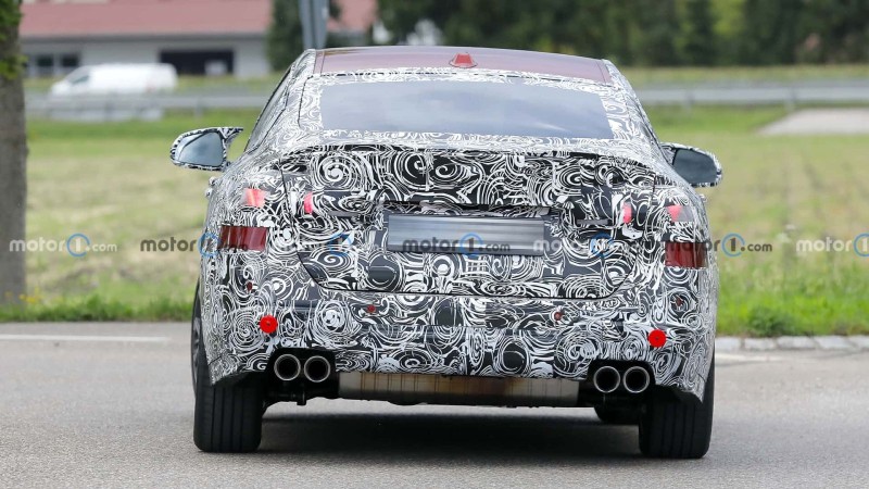 위장막 때문에 그릴이 조금 이상해 보이지만, 4개의 배기구가 있고 투톤 휠과 푸른빛의 고성능 브레이크 캘리퍼가 달려 있네요. 스포일러도 붙어 있습니다.