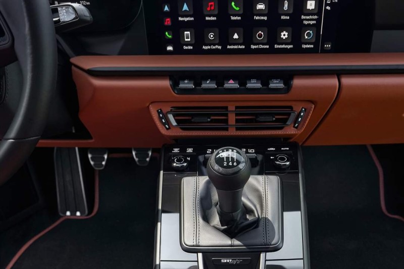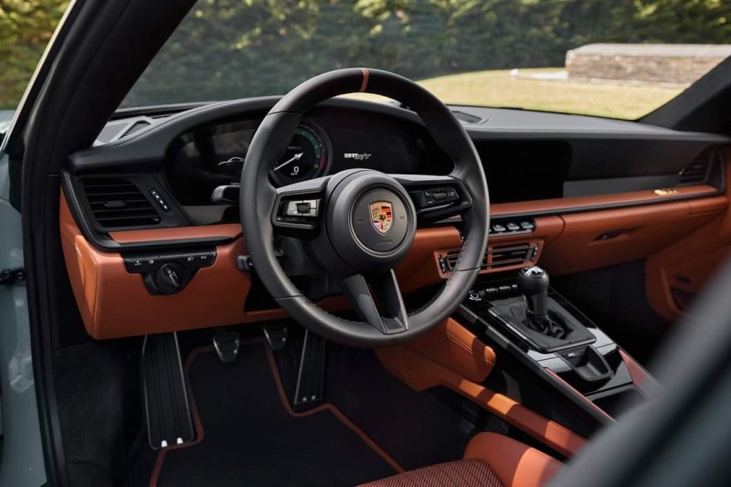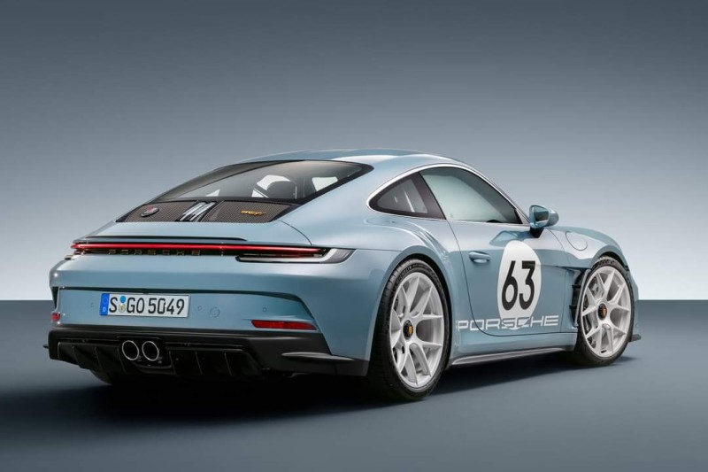이 밖에도, 클래식 코냑 컬러가 적용된 천 소재의 시트 센터가 특징으로, 이는 브랜드 헤리티지에 대한 또 다른 오마주 요소다. 블랙/클래식 코냑 가죽에 투 톤 세미 아닐린 가죽 트림, 다이나미카 소재의 타공 패턴 루프 라이닝과 포르쉐 익스클루시브 매뉴팩쳐의 다양한 요소들이 패키지를 완성한다. 차량 후면의 포르쉐 로고와 911 S/T 모델 레터링은 골드 컬러로 장식된다.