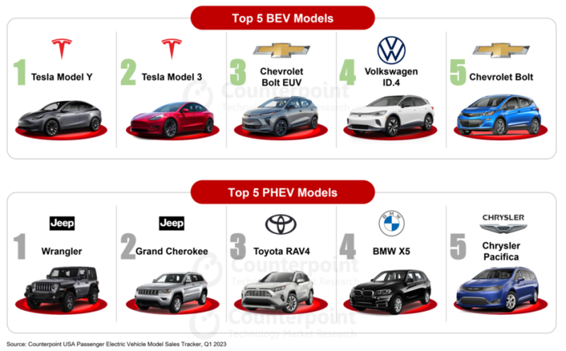 출처: 카운터포인트 2023년 1분기, 미국 승용 전기차 모델 판매량 트래커