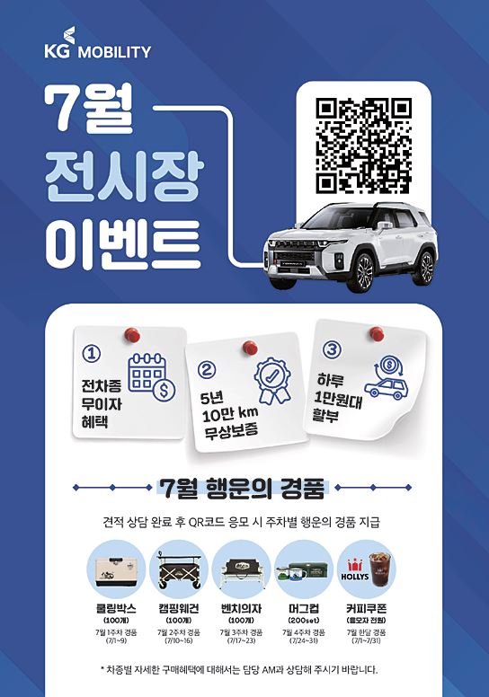 KG 모빌리티가 7월 한 달 동안 전시장 방문 이벤트 및 무이자 할부 등 고객 맞춤형의 다양한 판촉 프로모션을 시행한다고 3일 밝혔다.