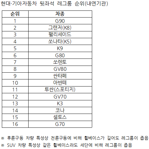 현대기아차 레그룸 순위라는군요