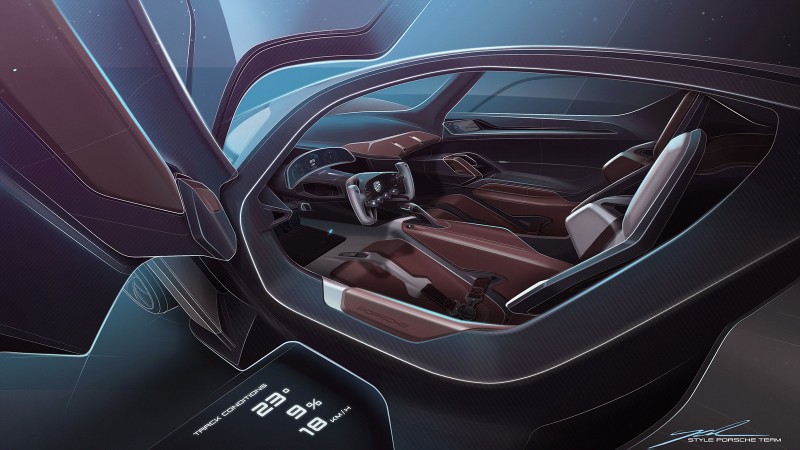 탄소 섬유 강화 플라스틱 소재 외골격이 적용된 경량 글래스 돔은 두 명의 탑승자가 탈 수 있는 실내를 광범위하게 덮는다. 르망 스타일의 도어는 A필러와 루프에 설치되어 있어 포르쉐 917 레이싱카와 같이 비스듬히 위로 열린다. 미션 X를 위해 포르쉐 특유의 4점식 그래픽을 재해석한 라이트 시그니처는 눈길을 사로잡는 요소로 자리한다. 포르쉐 906과 908 같은 역사적인 레이싱카에서 영감을 받은 수직 베이스 형태의 헤드라이트는 도로 방향을 잘 비출 수 있도록 충분히 내려가 있다. 하이테크 지지 구조는 LED 라이트 모듈 프레임화와 함께 외부로 노출된 얇은 주간 주행등과 지시등을 강조한다. 라이트는 작동 시 눈을 깜빡이는 듯한 모습으로 켜지며, 완전히 켜졌을 때의 헤드라이트는 자신감 넘치는 모습을 연출한다.