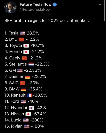 지난해 기준 브랜드별 전기차 이익률이라는데