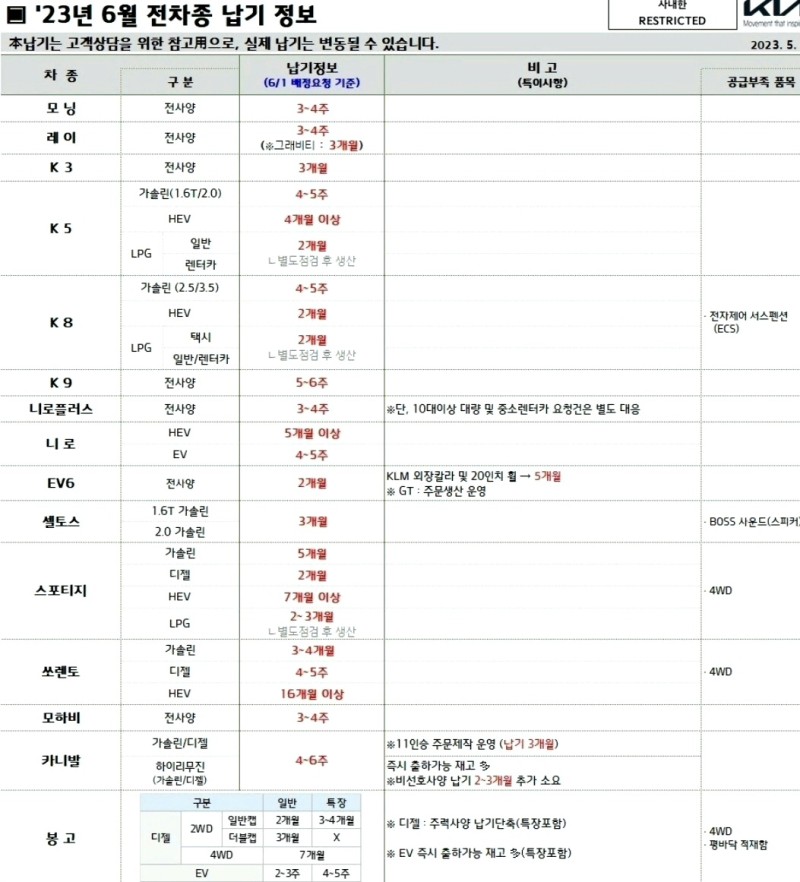 현대 기아 6월 기준 납기표, 많이 줄었네요 튜닝9 0 282 0 2023.06.01 22:56 여러가지 이유가 있긴 하지만 예전에 비해서 정말 많이 줄긴했네요하이브리드 차종 몇개 빼면 거의 한두달이면 받겠군요 0