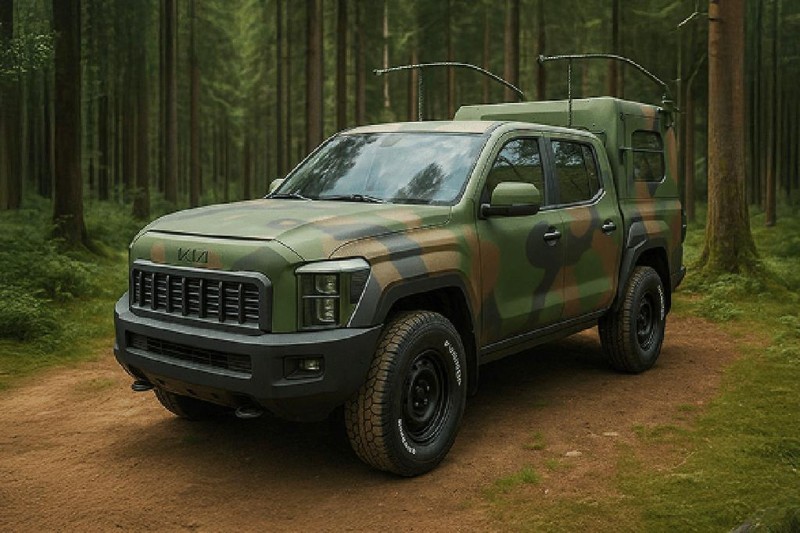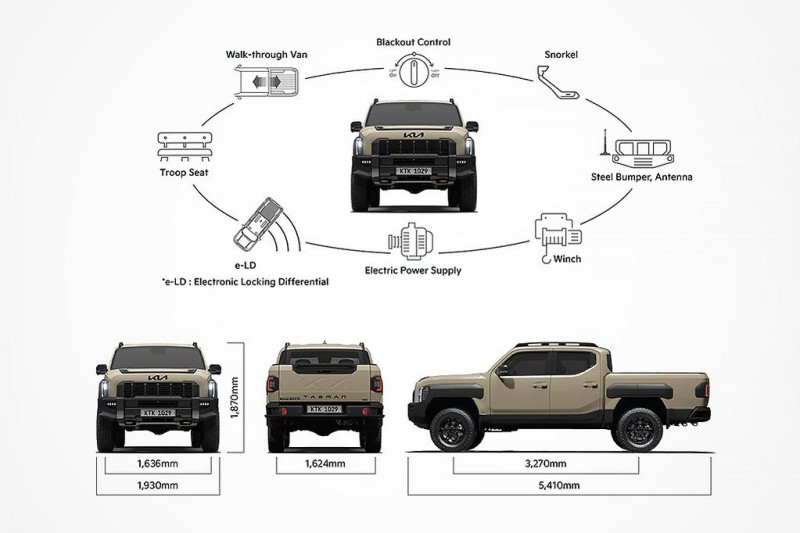 연간 2만 대 판매 목표를 설정한 기아로서는 초기 소비자 피드백을 외면하기 어려운 상황이다. 이번 군용 콘셉트 렌더링 공개는 디자인 개선에 대한 브랜드의 의지를 보여주는 신호로 읽힌다. 공개된 버전은 '밀리터리 커맨드 비히클(Military Command Vehicle)'과 '밀리터리 버전 픽업트럭(Military Version Pickup Truck)' 두 가지다. 각각 위장무늬 도색과 매트 그린 컬러를 적용하고, 블랙 범퍼, 스틸 바, 흑색 조명, 병력 수송용 시트, 후륜 전자식 디퍼렌셜 락(LD) 등 군 작전 수행을 위한 다양한 특수 사양을 갖췄다.