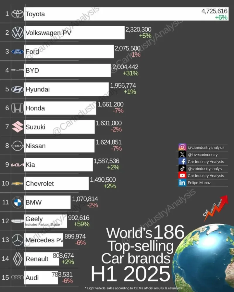 2025 H1 자동차 브랜드별 글로벌 판매 순위