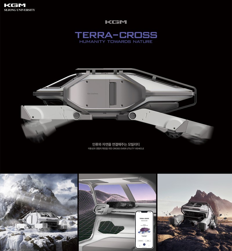 첫 번째 작품 ‘TERRA-CROSS’는 인류와 자연의 공존이라는 콘셉트를 바탕으로 차량의 이동성과 접근성을 강조해 제작한 크로스오버 모델이다. 오픈형 로봇 암&매카넘 휠을 적용해 이동의 자율성을 보장함과 동시에 견고하면서도 안락한 탑승 경험을 제공하는 형태적, 기술적 균형미를 표현했다.