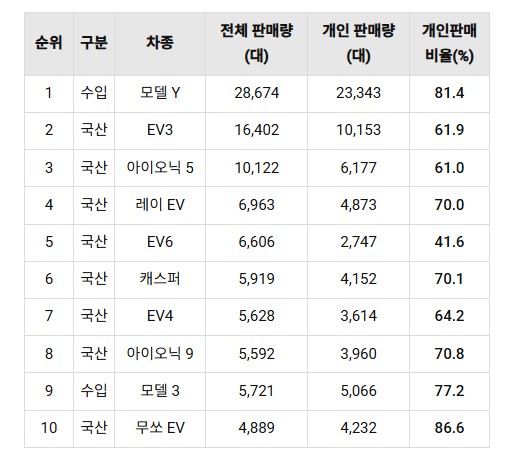 국내 2025년 1월~8월 전기차 판매 Top 10