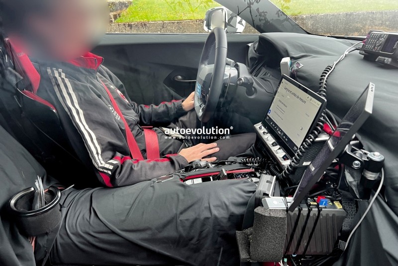 이번 스파이샷에서 블랙·레드 투톤 인테리어, 평평한 하단의 스티어링 휠, 대형 패들시프트, 토글식 기어 셀렉터가 확인됐습니다. 센터 콘솔은 하이글로시 마감, 공조 컨트롤은 물리 버튼으로 남아 있어 양산형 실내에 가깝습니다.