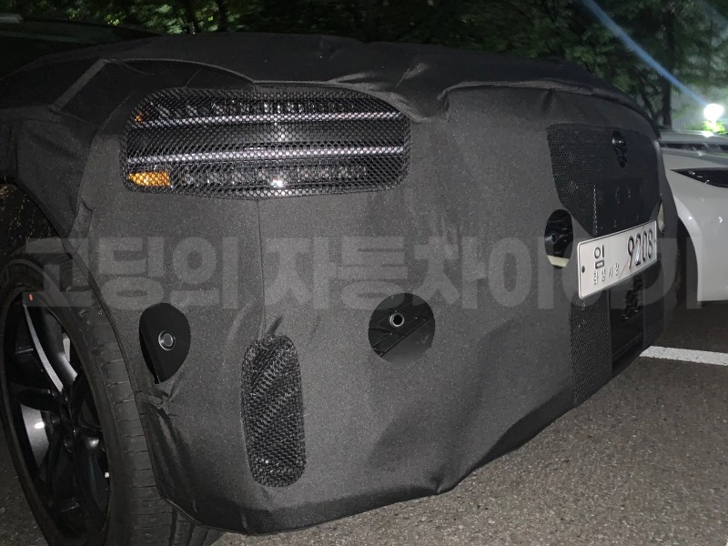 전면부는 큰 변화가 보이지는 않습니다. 북미형 모델 특성상 추가된 차폭등이 있고, 그릴은 현행 GV70 내연기관 스탠다드 모델의 패턴과 동일합니다. 하지만 하단 범퍼가 스포츠 모델과 동일하거나 유사한 스타일로 변경되는 것을 확인했습니다. 추가로, 하단 그릴부에 액티브 에어 플랩의 적용 가능성도 있을 것 같다는 생각이 듭니다.