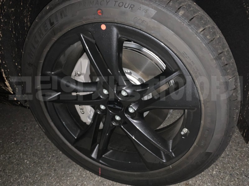 측면부의 휠은 블랙 마감이 되어있습니다. 전체적으로 현행 GV70 내연기관 스탠다드 모델의 휠이 떠오르는 디자인이면서도, 두줄의 모습을 담은 것이 특징입니다. 그냥 딱 깔끔한, 단조로운 휠 디자인이라 개인적으로 마음에 듭니다.