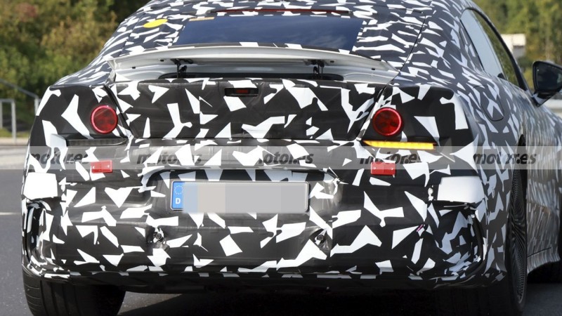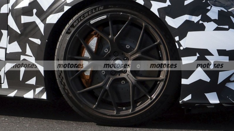위장막 사이로 보이는 디테일도 눈길을 끕니다. 전면 유리 아래쪽에 열 배출을 위한 통풍구가 자리할 것 같고, 거대한 카본 세라믹 브레이크와 금색 캘리퍼는 고성능 버전을 암시합니다. 타이어는 전륜 275/35 ZR21, 후륜 315/35 ZR21 사이즈가 들어가 있네요. 저속에서도 올라와 있던 리어 스포일러도 인상적입니다.